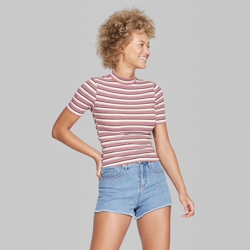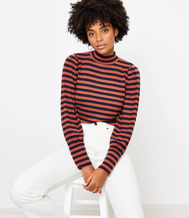 Women's striped mock neck tops.